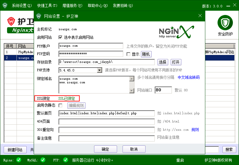 如題,護(hù)衛(wèi)神·Nginx大師V3.0.0版本升級(jí)后,可以很輕松的支持綁定SSL證書到網(wǎng)站了,也就是可以通過https協(xié)議來訪問您的網(wǎng)站了。