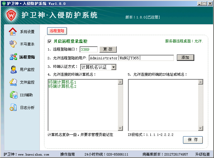 (1)計(jì)算機(jī)名認(rèn)證(圖1):假設(shè)您擁有1臺電腦A,1臺服務(wù)器B,通過A對B進(jìn)行遠(yuǎn)程管理,B安裝有護(hù)衛(wèi)神,那么,就需要將A的計(jì)算機(jī)名輸入到B的護(hù)衛(wèi)神允許遠(yuǎn)程的計(jì)算機(jī)名中,可以換行分隔輸入多個(gè),設(shè)置后,只有終端計(jì)算機(jī)名在該列中的,才能對B進(jìn)行遠(yuǎn)程管理,其他終端計(jì)算機(jī)名的計(jì)算機(jī)將會(huì)被攔截。